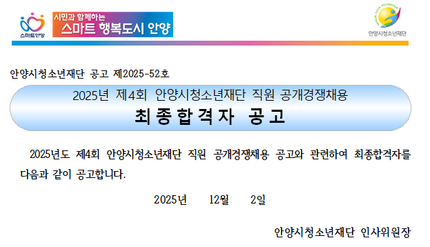 | 제목 | [공고]2025년 제4회 안양시청소년재단 직원 공개경쟁채용 최종합격자 공고 |
