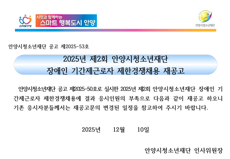 | 제목 | [재공고]2025년 제2회 안양시청소년재단 장애인 기간제근로자 제한경쟁채용 재공고 |