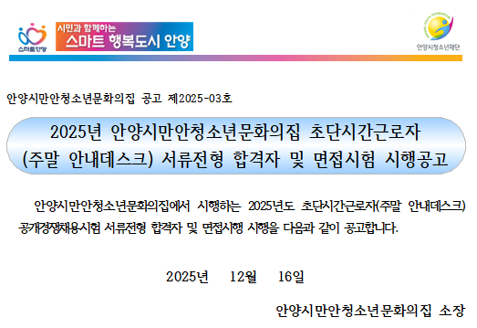 | 제목 | [공고] 2025년 제1회 만안청소년문화의집 초단시간근로자(주말 안내데스크) 서류전형 합격자 및 면접시험 시행공고 |