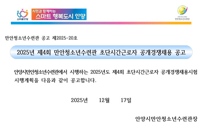| 제목 | 2025년 제4회 만안청소년수련관 초단시간근로자 공개경쟁채용 공고 |