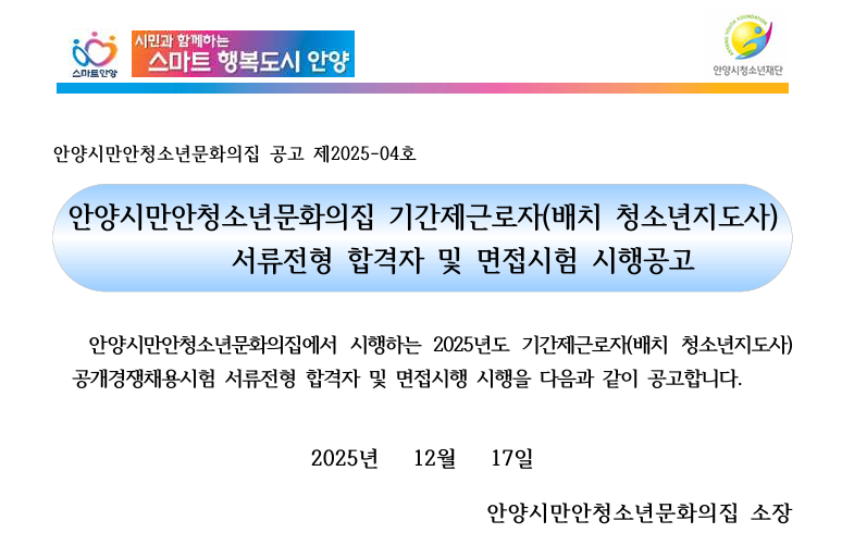 | 제목 | [공고] 2025년 제1회 만안청소년문화의집 기간제근로자(배치 청소년지도사) 서류전형 합격자 및 면접시험 시행공고 |