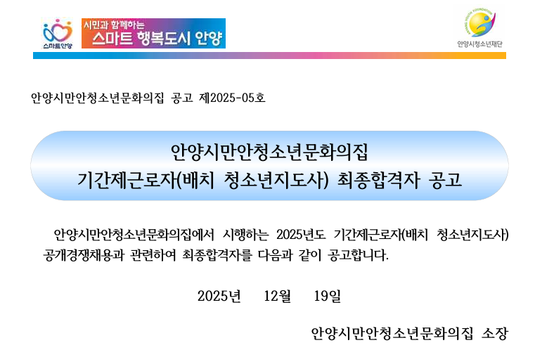 | 제목 | [공고] 2025년 제1회 만안청소년문화의집 기간제근로자(배치 청소년지도사) 최종합격자 공고 |