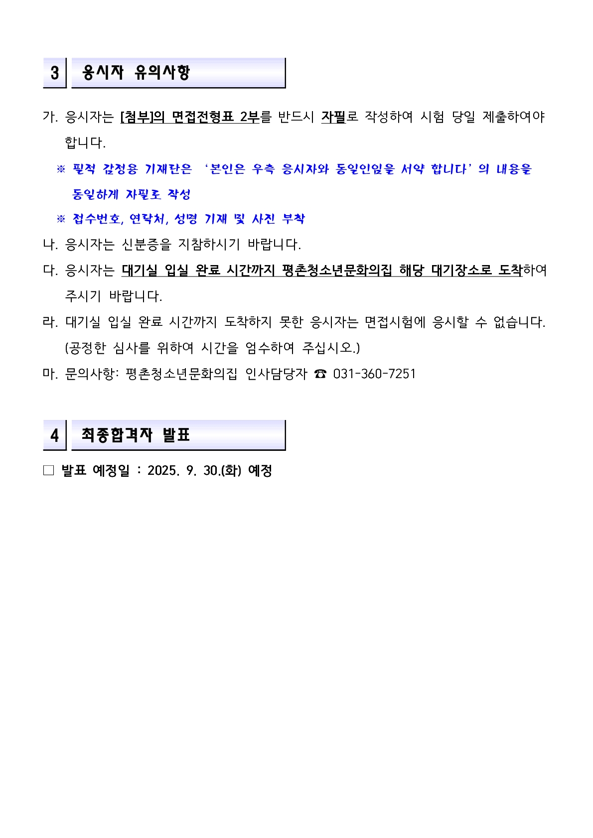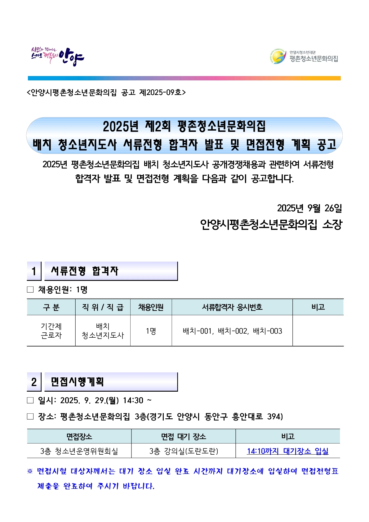 | 제목 | [공고]2025년 제2회 평촌청소년문화의집 배치청소년지도사 공개경쟁채용 재공고 서류전형 합격자 및 면접시험 시행계획 공고 |