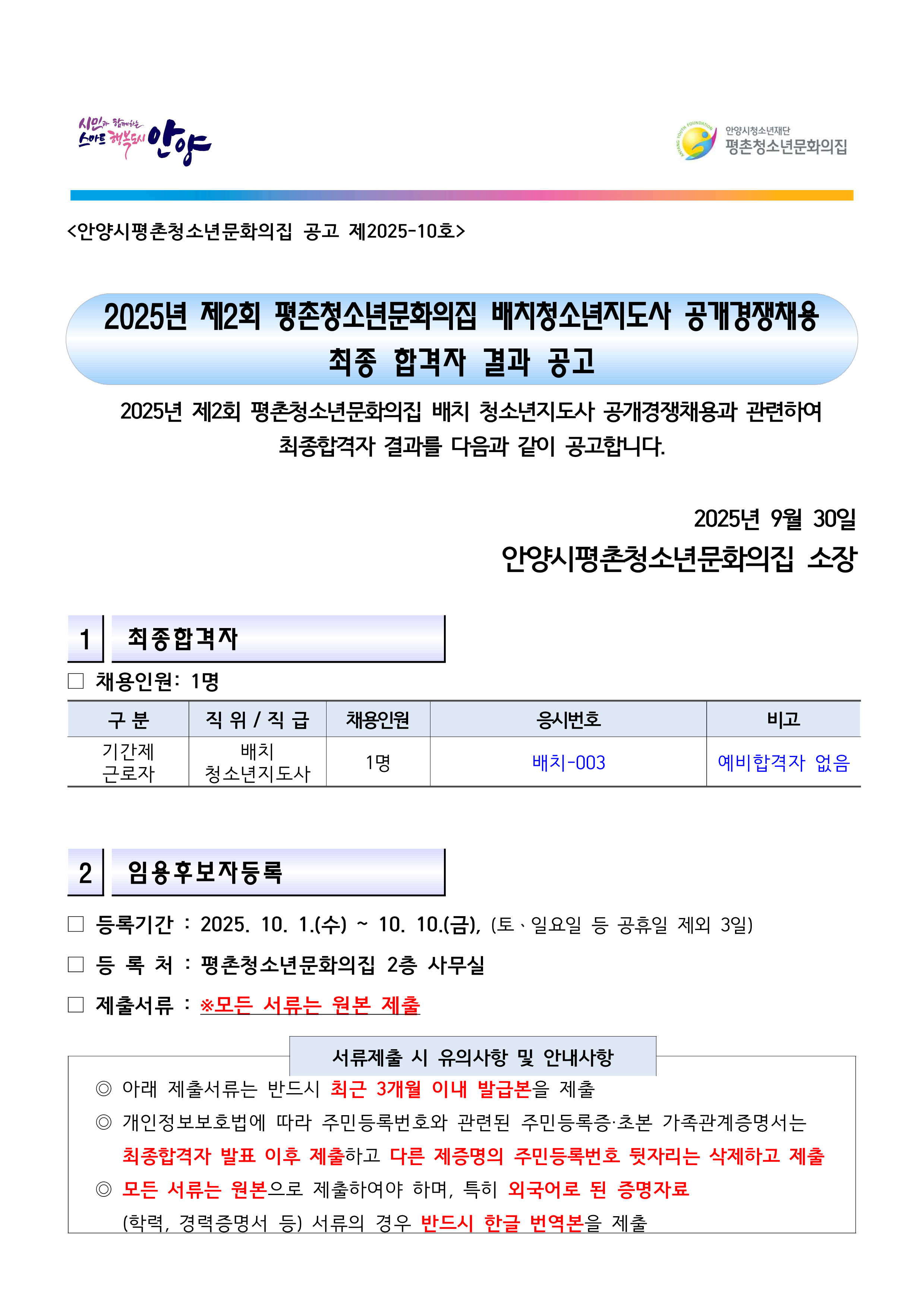 | 제목 | [공고]2025년 제2회 평촌청소년문화의집 배치청소년지도사 공개경쟁채용 최종합격자 공고 |