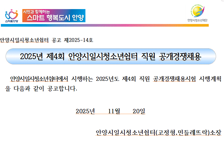 | 제목 | [공고]2025년 제4회 안양시일시청소년쉼터 직원 공개경쟁채용 공고 |