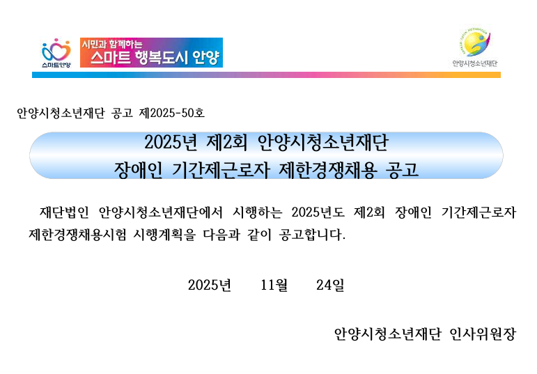 | 제목 | [공고]2025년 제2회 안양시청소년재단 장애인 기간제근로자 제한경쟁채용 공고 |