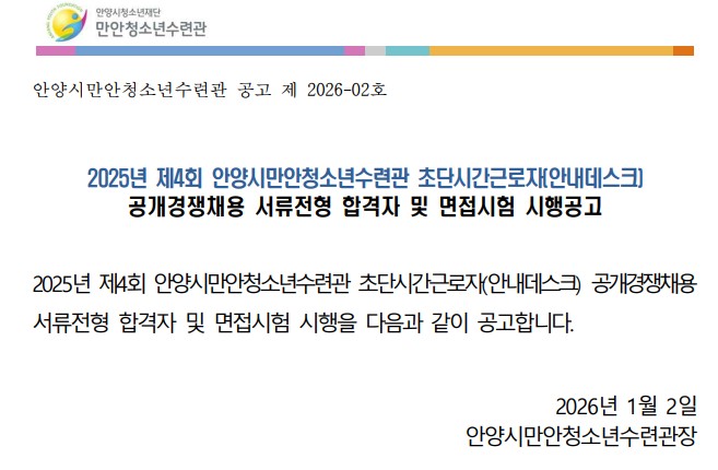 다음 2025년 제3회 만안청소년수련관 공개경쟁채용 면접시험 결과보고 및 최종 합격자 공고