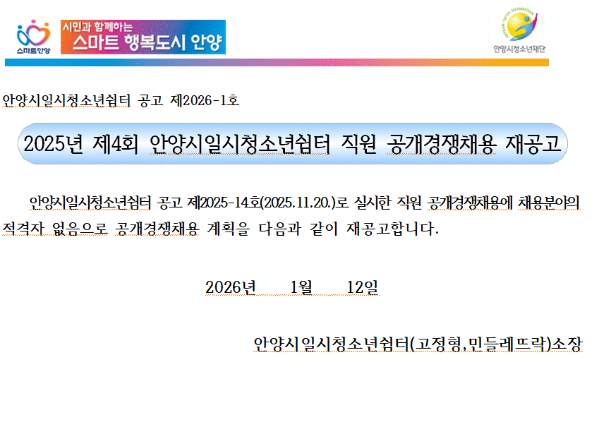 | 제목 | [공고]2025년 제4회 안양시일시청소년쉼터 직원 공개경쟁채용 재공고 |