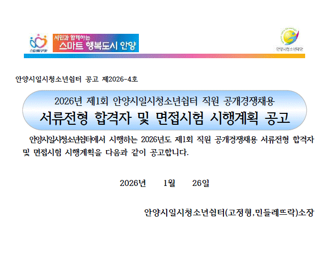 | 제목 | [공고]2026년 제1회 일시청소년쉼터 직원 공개경쟁채용 서류전형 합격자 및 면접시험 시행계획 공고 |