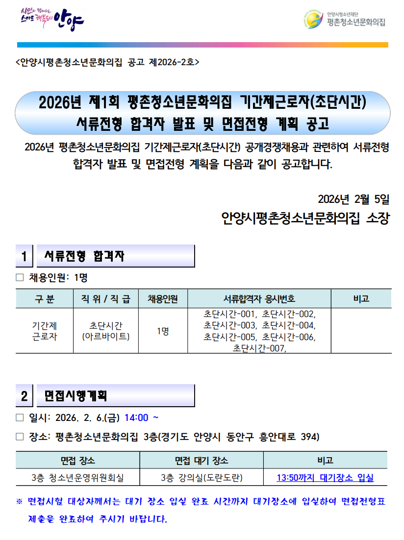 [공고]2026년 제1회 평촌청소년문화의집 기간제(초단시간)근로자 공개경쟁채용 서류전형 합격자 및 면접시험 시행계획 공고
