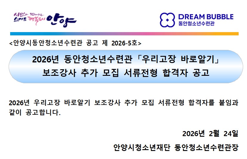 | 이전 | [공고]2026년 제1회 안양시청소년재단 직원 공개경쟁채용 최종합격자 취소 및 추가합격자 공고 |