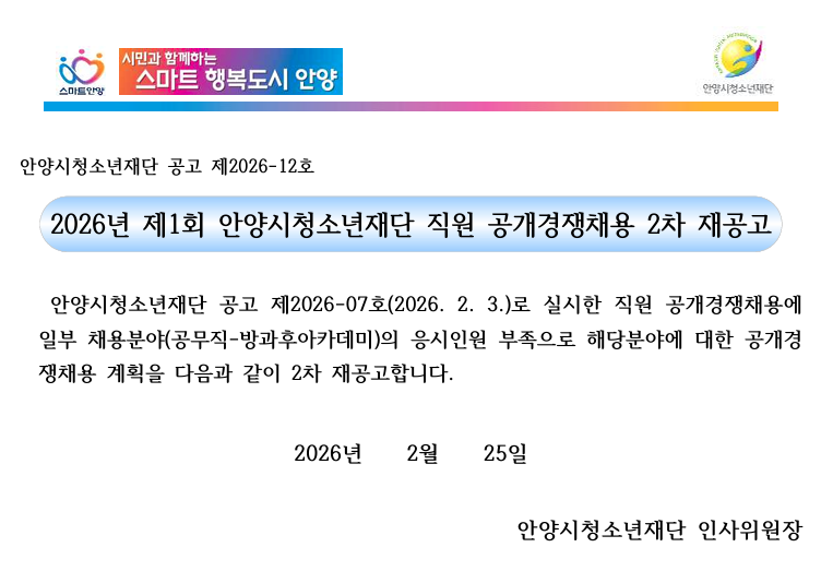 | 제목 | [2차 재공고]2026년 제1회 안양시청소년재단 직원 공개경쟁채용 2차 재공고 |