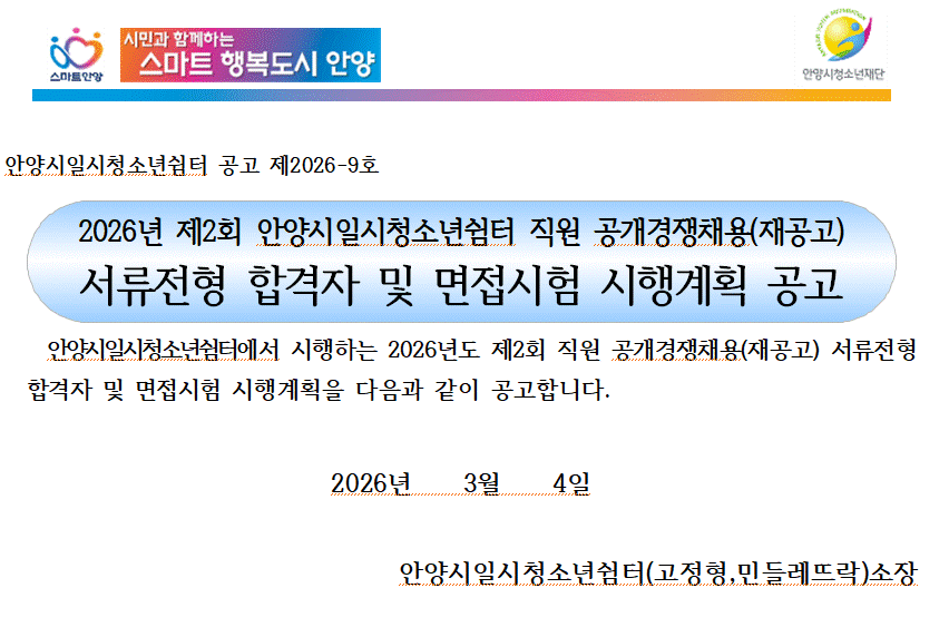 | 다음 | [공고]2026년 제2회 일시청소년쉼터 직원 공개경쟁채용(재공고) 최종합격자 공고 |